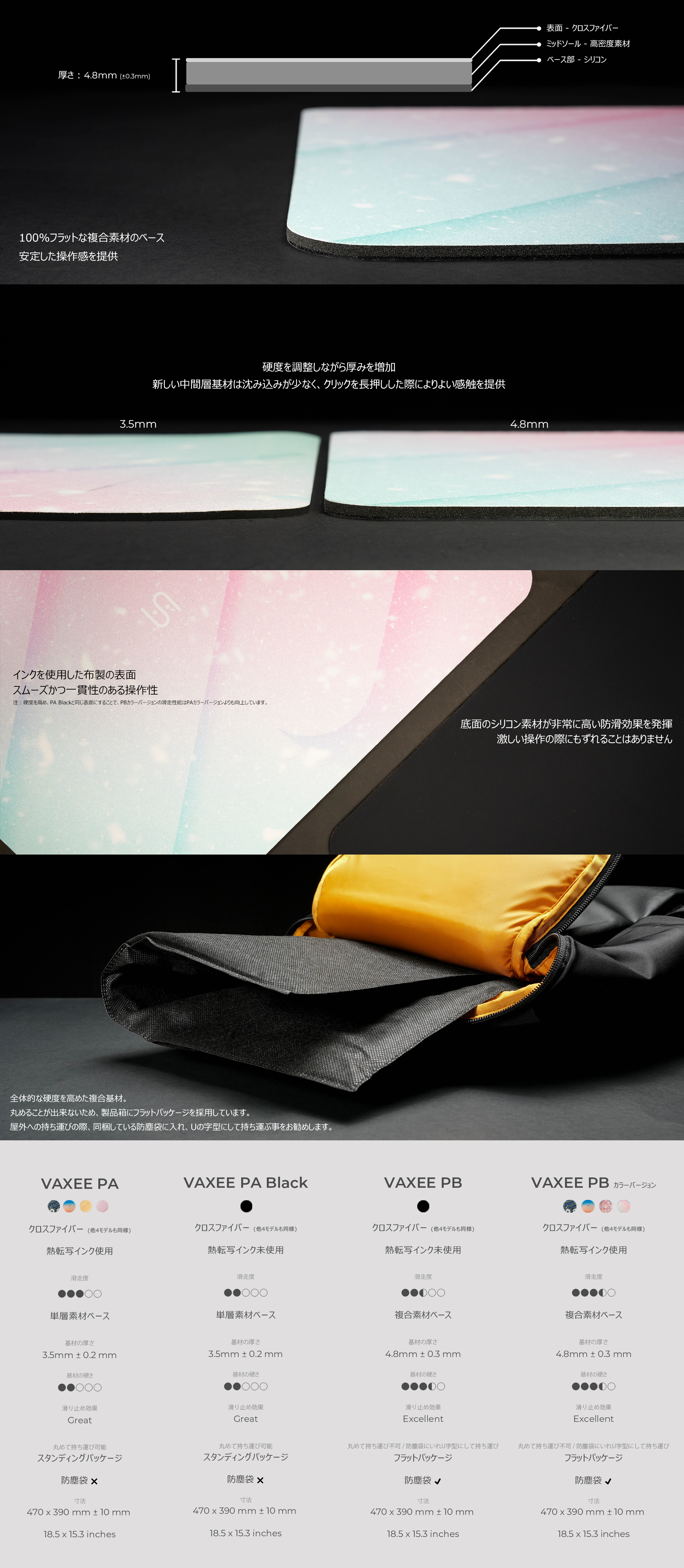 清掃の際の注意事項:新型PBは中間層の素材がPAと異なっております。アルコールや化学成分を含む洗浄剤を表面に吹きかけますと、浸透し中間層の変形や凹凸ができてしまう原因となりますので、使用しないでください。洗濯機や水洗いも製品を傷つけてしまう可能性があるので、湿らせた柔らかい布や純水のウエットティッシュで表面を拭くことでの清掃をお勧めしております。