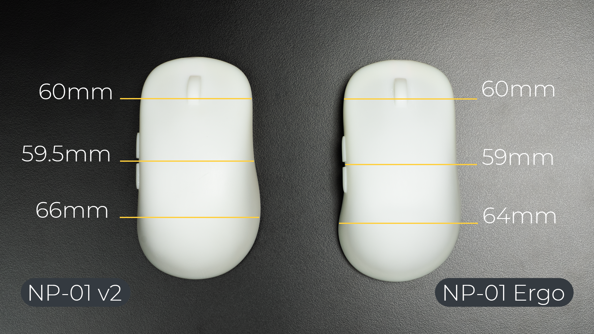 NP-01v2與NP-01 Ergo的外型都已經完成,我們測量了兩者的尺寸提供給大家參考,這兩款滑鼠都能提供給使用者飽滿、支撐性強且穩定的操作手感。